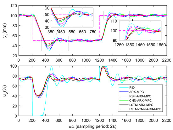 The control outcomes of distinct algorithms in a low liquid level zone (50–100 mm) are presented in Figure 11 and Figure 12 and Table 3, and the LSTM-CNN-ARX-MPC approach shows significantly superior control performance compared to other algorithms. In the falling step response of LSTM-CNN-ARX-MPC, the PTs of liquid levels and are 252 s and 224 s, the Os are 15.6% and 14.0%, and the ATs are 336 s and 320 s; in the rising step response, the Os are 3.2% and 3.6%, and the ATs are 166 s and 160 s, respectively, which are superior to other methods. This is due to the LSTM-CNN-ARX model incorporating the strengths of LSTM for learning temporal characteristics and CNN for capturing spatial characteristics, which can efficiently capture the water tank system’s nonlinear characteristics and achieve outstanding control performance. It should be noted that the PT of LSTM-CNN-ARX-MPC may not always outperform other methods. However, the evaluation of control performance is not just about looking at PT; we also need to see other indicators, such as O and AT. In fact, the O and AT of LSTM-CNN-ARX-MPC are much smaller than those of other methods, so overall, LSTM-CNN-ARX-MPC outperforms other methods. Usually, for controllers, their smaller PT may result in a larger O and AT, and there may also be significant oscillations at the beginning of the control process.