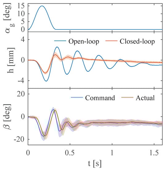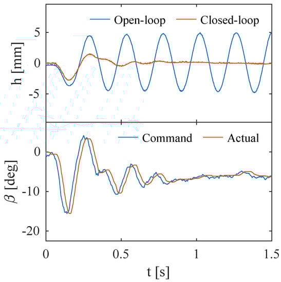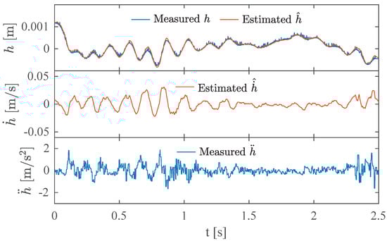 The GLA results are presented in this subsection. In the wind tunnel test, and were chosen for the controller gains based on the desired eigenvalues of the closed-loop system. The nominal control effectiveness for 12 m/s was identified from a wind tunnel test as . The open- and closed-loop experiments were performed for gust frequencies of 3, 3.5, 4, 4.5, and 5 Hz, and a gust amplitude of . In addition to the directly measured outputs and h from the IMU and LVDT, a Luenberger observer with eigenvalues was applied to provide an estimation of by using the measurements of the heave displacement and acceleration. was required for the implementation of the control law as shown in Equation (19). An overview of the measured and estimated signals is shown in Figure 5.