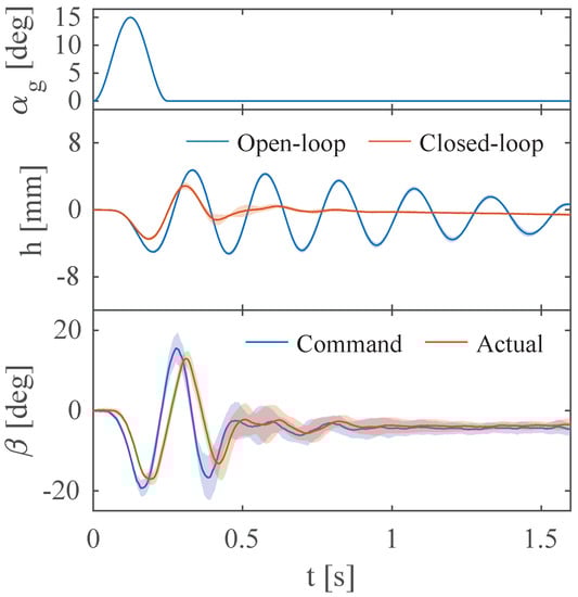 The heave displacement comparisons between open- and closed-loop gust responses when the gust frequency Hz. is the gust’s input angle while is the control surface’s reflection angle.