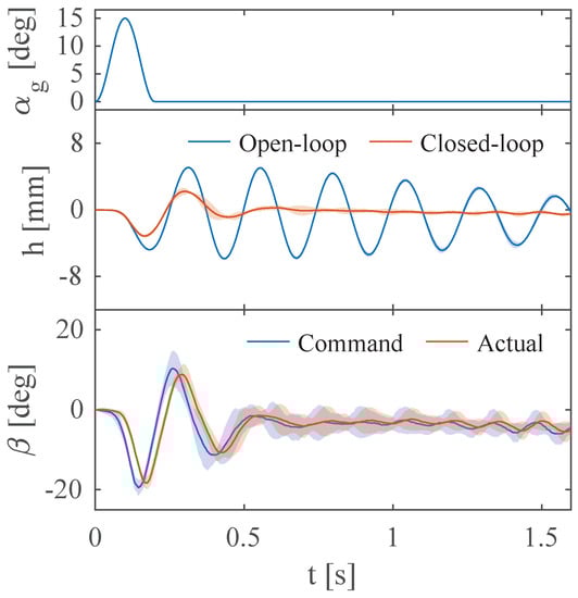 A summary of the GLA results in terms of the reduction of the absolute peak value and RMS heave values for all previously mentioned gust frequencies is shown in Table 2, where the absolute peak heave value relates to the peak load endured by the wing, and the RMS value gives a measure of the vibrational loads the wing endures, related to the fatigue life of a structure. The mean, minimum, and maximum reduction rates for both the absolute peak and RMS values are given. Overall, the proposed INDI control method, without adjusting control gains, provides an attenuation higher than for the vibration amplitude due to a gust disturbance, and an attenuation higher than for the RMS(h). The greatest reduction in absolute peak and RMS mean values are achieved for a gust frequency of 5 Hz, with values of 71.4 and 44.2%, respectively. Previous results show the overall lowest damping coefficient for the open-loop gust response at 5 Hz, giving the highest RMS value. The controller quickly damps out the gust-induced oscillations, leading to the second-lowest closed-loop RMS value, hence the greatest reduction in RMS. Similarly, this is also the case for the absolute peak value, with the highest open-loop peak value and the second lowest peak value.