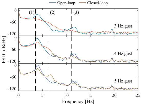 A comparison between the open- and closed-loop gust responses’ power spectral density when the gust frequencies are 3, 4, and 5 Hz.