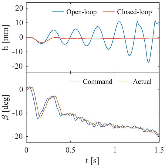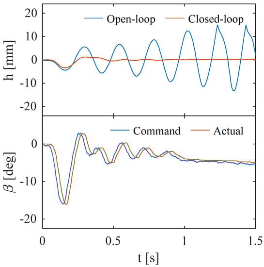 Figure 10, Figure 11, Figure 12 and Figure 13 show a comparison of the open- and closed-loop heave response and the commanded and actual aileron deflection for the closed-loop response for increasing flow velocities past the open-loop flutter velocity. All open-loop responses to the excitation start with a 5 mm amplitude and expectedly oscillate with a frequency around 4 Hz, again close to the first heave mode. Figure 10 and Figure 11 show a clear diverging open-loop response. The closed-loop responses show the reduction of the heave response to the initial excitation compared to the open-loop response, after which the disturbance is damped out within approximately one period.