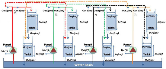Let us introduce a benchmark process that can be decomposed into four input-coupled sub-systems. Namely, two quadruple-tank processes, described in [46] (consisting of two sub-systems each) were connected in a circular architecture (i.e., sub-system 1 coupled with sub-system 4, which is coupled with sub-system 3, which is coupled with sub-system 2, which is coupled with sub-system 1), obtaining an eight-tank process, introduced in [40]. In Figure 1 (from [40]), the schematic diagram of the eight-tank process is provided. For this process, the idea is to control the water level in the lower tanks (, , , ) by manipulating the corresponding water flows (i.e., implicitly, by changing the voltages of the four pumps , , , ). Note that, the sub-systems are coupled through the inputs (marked in Figure 1 with dashed coloured lines). Thus, a percentage of the water flow provided by pump from sub-system 1, influences the water level from sub-system 2 (see the water flow marked with red dashed arrow).