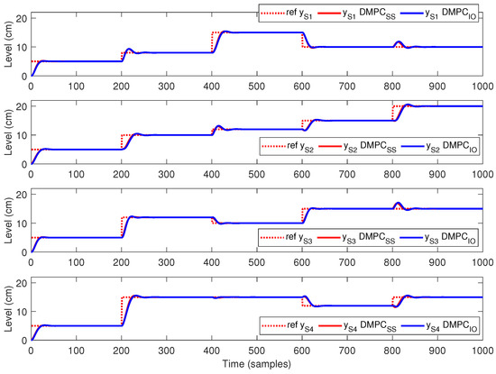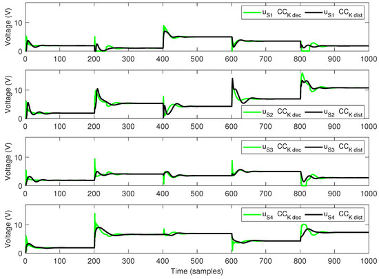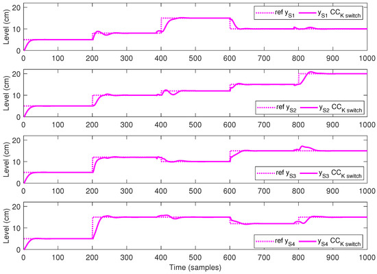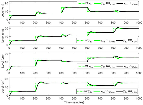 where M is the length of the simulation time and , and are the measured output, the imposed reference and the computed input of sub-system , , at sample time k. As the numerical values given in Table 2 show, the has a slightly smaller cost index than the . When comparing the coalitional strategies using the same criteria, as expected, it results in the coalitional control with the switching communication topology outperforming the other two CC strategies, with the smallest .