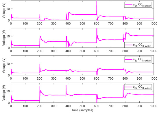 For clarity, only the first 4 out of 50 references are depicted in Figure 9. For all 50 references, the was computed and is provided in Table 3. The results show that there are situations (see and ) in which the switching dynamics for selects only one strategy for the entire simulation. In this case, for that reference, there are two equal values for . For each algorithm, the mean of values from Table 3 is 7.32 for , 4.08 for , 6.96 for , 8.39 for and 7.02 for . These mean values reinforce the initial findings, i.e., that the coalitional control strategy has a similar performance to .