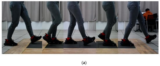 The movement mode and range of human lower limb joints are limited, with the range of hip joint flexion/extension angles being −30°/120° and knee joint flexion/extension angles being −120°/0° []. After determining the angle range, it is necessary to collect the angle changes during the motion process, so the infrared NOKOV capture system is used for dynamic capture experiments on the human body, as shown in Figure 5a,b.