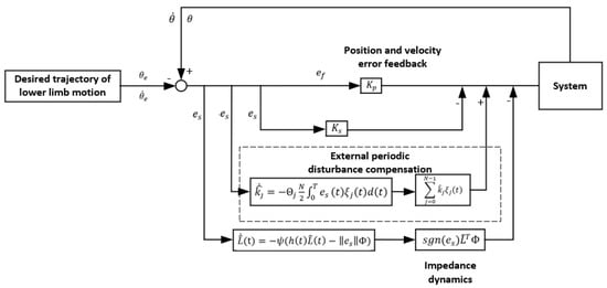 Due to the differences in various physical parameters, degree of damage, and rehabilitation stages among different patients, multiple corresponding rehabilitation plans are required. Therefore, lower limb rehabilitation robots generally have problems of low control accuracy and poor universality [,]. In order to meet the requirements of adaptive control for lower limb rehabilitation robots in different patient rehabilitation processes, a periodic repetitive learning control was designed using external periodic cyclic disturbances [] and the method of solving approximate values of unknown dynamics and periodic disturbances. Corresponding to the muscle tension, joint friction, and mechanical equipment errors that may be generated by different patients [], advance compensation and fitting estimation values were carried out. The implementation of lower limb rehabilitation robots has high accuracy and universality characteristics.