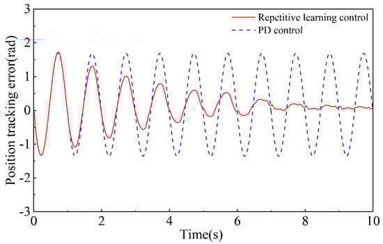 In order to verify the effectiveness and stability of the above repetitive learning system, this paper will use repetitive learning control and PD control to compare the performance of the motion position and speed of the joints, respectively, so as to verify that the repetitive learning control has a more stable and accurate control effect in the face of external periodic disturbance.