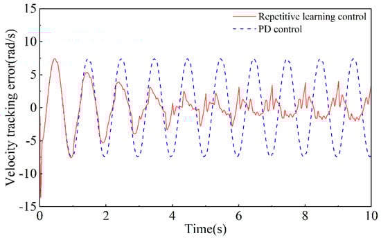 Through simulation experiments, the tracking error results of repetitive learning control and PD control can be obtained, as shown in Figure 10 and Figure 11. Figure 10 shows the different position tracking effects of the same joint under repetitive learning control and PD control. The blue dashed line represents the error fluctuation through PD control, and the tracking error amplitude has almost no change with the periodic fluctuation of the input signal and external disturbance signal. The red solid line represents the periodic repetitive learning control system, and the tracking error continues to decrease and stabilize with the continuous repetition of the gait cycle, which realized the early compensation function for external periodic disturbances. Figure 11 shows the comparison of speed tracking errors achieved by repetitive learning control and PD control. It can be seen that regardless of how long it has been since the motion cycle has passed, the speed error under PD control always fluctuates steadily with the cycle. However, repetitive learning control significantly reduces the range of speed fluctuation values after a few motion cycles, which can prove that repetitive learning control has better performance in speed tracking.