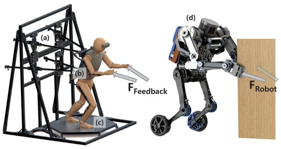 Dynamic teleoperation system with human–machine interface (HMI): (a) backdrivable linear actuators, (b) high-speed motion capture system, (c) force plate, and (d) teleoperated robot.
