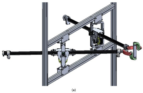 For this reason, most commercial haptic interfaces use parallel linkage-based mechanisms such as the delta mechanism [] or four-bar linkages [,,]. Parallel linkages enhance structural stiffness of the system while limiting ROM because of their structural complexity. The commercial haptic interfaces cited above show force capabilities of less than 20 N because high reduction ratio gears are avoided to ensure high transparency. The 3-DOF Orthogonal Tripteron mechanism introduced in [] allows fully decoupled motion of all three axes; thus, the kinematics and dynamics are simple. However, the stiffness is limited because of the bending of linkages. Interference between rotational linkages and the user becomes problematic when the system is upsized. The actuators are high-speed small-torque motors with gear reductions.