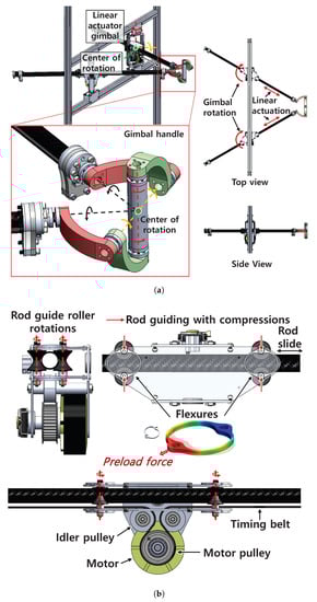 The main limitations of previous haptic systems are induced by friction and inertia from gearing [] as well as by low stiffness caused by bending of the linkages. We propose a haptic interface with modular linear actuators that can overcome these limitations (Figure 3a). The modular linear actuators proposed in [] are connected in parallel to the end-effector. The actuator has high-torque low-inertia motors and a timing belt-based reduction system that together enable a high force capability of up to 100 N and backdrivable actuation with small friction. Thus, the haptic interface is very transparent. The actuator can be rotated with a 2-DOF gimbal that holds a carbon fiber rod with flexures and rollers to constrain the rod and other parts in terms of rotation while allowing linear actuation (Figure 3b). Details of the actuator design are provided in [].