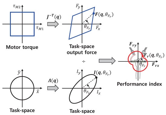 Here, indicates the direction of the generated force, which corresponds to a set of actuator torques or the direction of the back-driven task-space inertial force, while is the inertia matrix determined by the actuator inertia and the system mechanism. The characteristics of the haptic force density are varied by the actuation mechanism, as is related to the Jacobian determined by the geometry of the device.