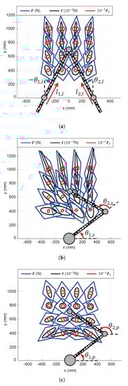 Figure 6 shows the force capability, reflected inertial force, and their ratio of a haptic interface with respect to (a) a parallel linear mechanism (this work), (b) a serial rotational mechanism, and (c) a parallel rotational mechanism. The motors are assumed to be at the bases, minimizing the inertia induced by the motor mass. The parallel linear mechanism represents the haptic interface mechanism proposed in this paper (Figure 6a), which has two passive rotational joints ( and ) and two linear joints actuated by the motor ( and ). Small rotational inertia is assumed because most of the mass (the motor and metal parts) are near the gimbal center. Thus, the linear actuator dynamics dominate the system, and are considered in the inertia matrix . The other two mechanisms are conventional haptic interface designs utilizing rotational actuation mechanisms. In a serial rotational mechanism [,,], the first motor actuates the first joint, which corresponds to , and the second motor is attached to the first link (Figure 6b). The second motor rotates the second joint () relative to the first linkage. In contrast, the motors of the parallel rotational mechanism are independent (Figure 6c). Both motors are fixed to the base and independently connected to the two joints. Thus, each joint motion depends only on the motor motion corresponding to the joint. The parallel rotational mechanism can be considered as a linearized version of linkage-based mechanisms [,,,,,] under the assumption that the transmission through the second joint is rigid enough.