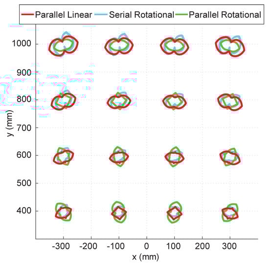 The blue lines in Figure 6 are the available force at each position in all directions (, while the black ellipsoids denote the reflected inertia when the end-effectors are backdriven with unit acceleration (). The haptic force density was calculated by dividing the force by inertia for all directions. As shown in the figure, the force and inertia characteristics differ depending on the mechanism. The parallel linear and rotational mechanisms show Cartesian coordinate-based characteristics, while the serial rotational mechanism has the characteristics of polar coordinates. The parallel mechanisms in Figure 6a,c exhibit more even force and inertia distributions than the serial mechanism, although visual comparison with separate figures is difficult.