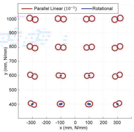 The other advantage afforded by the proposed haptic interface mechanism is structural stiffness. As the force is delivered to the end-effector along a linear axis, there is no bending deflection for the linear actuator. As the linear stiffness is determined by the timing belt stiffness, the resulting end-effector stiffness can be as high as that of the timing belt. Figure 8 shows the structural stiffnesses of the linear parallel and rotational mechanisms. Here, both the rotational and parallel linear actuators are fixed at several target points. The rods of the rotational mechanisms have the same dimensions and properties of the carbon fiber rod as the proposed 2-DOF haptic interface. A 1-mm displacement is applied to the end-effectors in all directions. The blue and red lines are the resulting force exerted by the displacement, which can be interpreted as the structural stiffness of the mechanism in units of N/mm. The axial deformation and bending of links were used for the stiffness calculation. The passive joints were assumed to be rigid for both mechanisms. Note that the stiffness of the parallel linear mechanism is scaled to 1/10 for easier visualization. As shown in Figure 8, the structural stiffness of the parallel linear mechanism is significantly greater under all configurations. The minimum stiffness of the rotational mechanism was 1.29 N/mm, while that of the linear parallel mechanism was 47.6 N/mm. This implies that the linear parallel mechanism can provide a high force bandwidth with superior structural stiffness, resulting in small inertia.