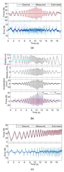 Zero current was delivered to the motor to identify the reflected inertia and the friction. A human then applied a chirp force to the linear actuator by holding a load cell mounted on the actuator end-effector; the displacement and load cell force were recorded with a sampling rate of 1 kHz. A least-square method was applied using the measured displacement and force from the load cell. Velocity and acceleration were calculated using the time-derivative of measured from the motor encoder and then smoothed using the moving average method. The University of Illinois at Urbana-Champaign Institutional Review Board reviewed and approved this research study, as well as the other research studies referred to in Section 4 and Section 5. Informed consent was obtained from the subject. Figure 10a shows the desired and measured forces, estimated force with the identified model, and estimation error. The root mean square (RMS) and maximum magnitude errors were 1.90 N and 9.98 N, respectively. This accurate identification was possible because the friction was included in the actuator model, unlike in []. The maximum error comes from static friction at zero velocity, which the Coulomb and viscous friction model cannot properly account for. More complex friction models, such as the Dahl and LuGre models, can be used to reduce this error; however, they are not employed here because this model is sufficiently accurate to describe dynamic motions at non-zero velocities and the Coulomb friction is small compared to the maximum actuator force. The identified values of the parameters were kg, N, and Ns/m. The reflected inertia of the rotor and idler pulley system was estimated as 0.583 kg by subtracting the actual inertia of the rod, timing belt, and tensioner. As shown in Figure 10b, friction dominates the undesirable forces when the acceleration is small, while the inertial force dominates during high-frequency motion. The identified friction and inertial parameters indicate that the actuator is highly backdrivable and has small inertia. As discussed in Section 2, these characteristics do not greatly change even if the ROM is expanded from the current 1.1 m because the inertia of the carbon fiber rod and timing belt is small.