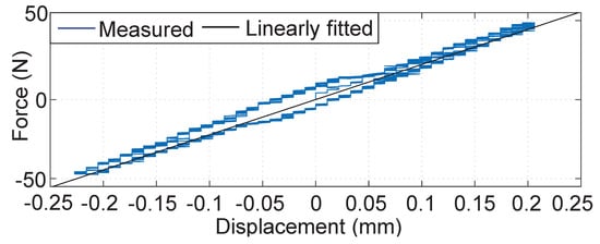 The frequency response of the linear actuator was tested to analyze the force capability in different frequencies. The end-effector was fixed to a solid frame and sinusoidal reference forces of different frequencies were commanded to the actuator. The magnitude was set to 50 N, which is half of the maximum force of the linear actuator. The results in Figure 11 show that the actuator force response had a cutoff frequency near 30 Hz and showed resonance around 100 Hz. Considering the characteristics of parallel linear actuation mechanism, the haptic interface is expected to show a similar force bandwidth if the end-effector is lightweight and the connection part is stiff enough. The longitudinal stiffness of the timing belt was identified as 222 N/mm by fitting a linear spring model to the data measured at a low frequency (1 Hz, Figure 12). Note that the actuator stiffness can be further reinforced by using a timing belt with higher longitudinal stiffness if the ROM is to be extended.