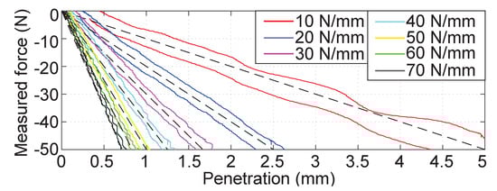 Displayable stiffness of the linear actuator. The dotted lines are the desired stiffnesses and the solid lines are experimental data.