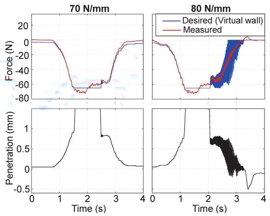 To investigate the maximum stiffness that the linear actuator can provide to the user, we conducted a stiffness rendering experiment. A human slowly pulled and released the load cell at the end of the linear actuator while rendering a virtual wall with a pure spring constant; the stiffness was varied in each trial. Figure 13 shows the experimental result. The actuator delivered a linear force feedback up to a stiffness of 70 N/mm. Rendering a virtual wall stiffer than 70 N/mm showed vibrations when the user released the actuator (Figure 14). This kind of stability issue may develop when the user-side impedance is low and the virtual stiffness is high []. Although the slight friction of the interface naturally dissipated energy, a stiffness of 80 N/mm resulted in instability. Despite the stability problem, small inertia is required to ensure transparency at high frequency for both impedance and admittance control []. The stability problem could be addressed in the sense of control, such as by applying a passivity-based controller []. The controller must be designed considering the stiffness of the application environment, such as the stiffness of the teleoperated robot or the virtual environment. We did not include such a controller here because this paper focuses on the design and analysis of the mechanism and the modular linear actuator. In addition, the instability due to rendering high impedance is greatly reduced in our system because it performs open-loop torque control based on the current. There is no feedback loop using a force/torque sensor. Our approach to open-loop force control has been previously demonstrated in legged robots [,].