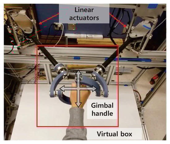 The performance of the proposed haptic interface was tested experimentally. A user rotated the gimbal handle as desired. As shown in Figure 15, the gimbal handle allowed free rotation of the user’s hand. The available ROMs were about to in pitch and to in roll. The yaw motion ranged from to until the user’s forearm reached to the gimbal. The force delivery of the interface was tested by rendering a virtual box; Figure 16 shows the experimental setup. A 300 mm × 300 mm 2D virtual box was created and a virtual force field with a stiffness of 2 N/mm was set to the edge. The maximum force that could be applied by an actuator was limited to 65 N, and the task-space force was limited to 100 N to ensure safety. Figure 17 shows the control diagram of the haptic interface. The end-effector force was controlled by a simple feed-forward (open-loop) controller using a Jacobian assuming quasi-static motion. The desired task space force was calculated as follows: