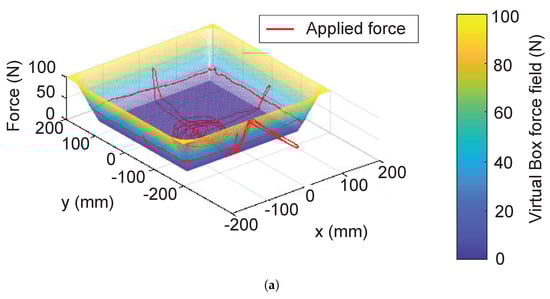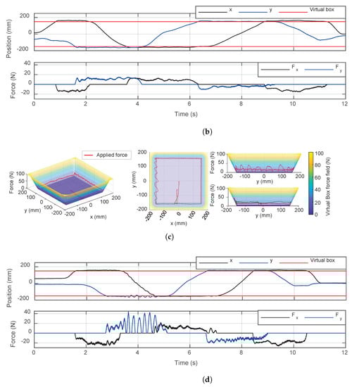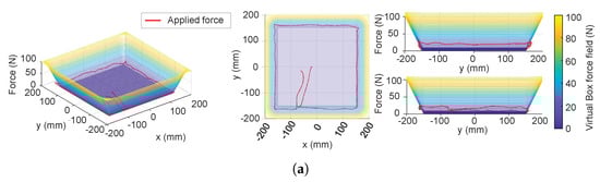 The user tested backdrivability in free space by moving the end-effector and interacted with the virtual box via force feedback. The video in https://www.youtube.com/watch?v=MEvPQ4PBzNM (accessed on 29 June 2023) shows the experiments conducted with the virtual box. As shown in the video, the user can freely rotate the hand with the DOFs of the gimbal handle. It was possible to interact with the virtual box under the guidance of the force field without inducing significant stability issues. Figure 18 shows the result of a similar experiment. The force field of the virtual box is shown as the color gradient in Figure 18a,b. The 2D end-effector trajectory and the forces applied at the points are shown as the red line. The time plot (Figure 18c) shows the result differently. The user was able to slide on the virtual surface with a contact force of near 25 N without significant effort in 7.7 s < t < 18.3 s. As the gimbal handle was fabricated from 3D printed plastic and the displayable stiffness of the haptic interface is limited by its stiffness, the available stiffness was limited to 2 N/mm. While the user could interact with the virtual environment under a lower stiffness (Figure 19a,b, N/mm), it was difficult to achieve natural contact under higher stiffness (Figure 19c,d, N/mm). The end-effector showed a bouncing motion under high stiffness; however, this could be improved if stiffer material were applied to enhance the stiffness of the entire system.