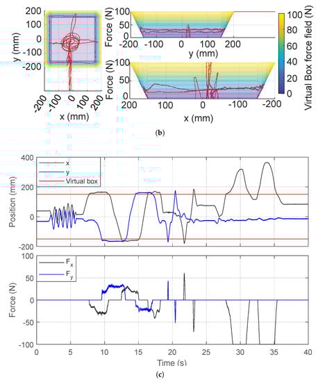Virtual box rendered as a potential field, showing the position and applied force on the end-effector in the interaction with the virtual box: (a) isometric view, (b) top and side views, and (c) time plot.