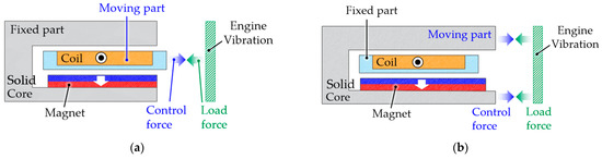 Electromagnetic actuators based on the Lorentz force can be divided into moving voice coil actuators (VCMs) [19,20,21] and moving inertial mass actuators (IMAs) [22,23,24]. Structurally, the IMAs and VCAs are similar in appearance, as shown in Figure 2. However, the moving part of a VCA is the coil part, as shown in Figure 2a. On the other hand, the coil part of the IMA as shown in Figure 2b is fixed, and the solid core and PM are used as the moving part to generate inertial mass force. An IMA typically consists of a mass that is mechanically connected to a load and can be accelerated or decelerated to create a force. It can generate higher force compared to a VCA by using an inertial mass; an IMA is, thus, more suitable for applications that require high force.
