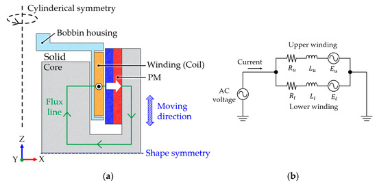 High inductance can cause a slow time constant, which can limit the overall performance. Thus, to reduce inductance, two parallel connections to the upper and lower parts, as illustrated in Figure 3b, are configured. Back-electromagnetic force (EMF) is induced in the winding when operating the moving part by changing the magnetic field of the PM.