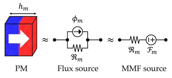 The equivalent circuit model of the PM that can be expressed both as a flux source and as a magnetomotive force (MMF) source can be expressed as shown in Figure 4. For the MEC in this work, an MMF source is selected. The MMF of PM is defined as follows: