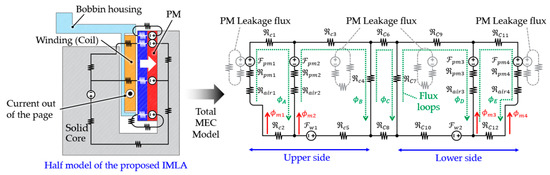 The total MEC model of the proposed IMLA considering the leakage flux of the PM is illustrated in Figure 5, where are the reluctances of solid cores, are the reluctances of the air gap containing the bobbing housing and winding, are the reluctances of the PMs, are the MMF of the PMs, and are the MMF of the windings. The width of the coil is smaller than that of the PM, and leakage flux, which does not generate a Lorentz force because it does not cross the coil, exists at the edges of both sides of the PM. The total MEC model without PM leakage flux shows that there are five flux loops of . Here, the practical flux that generates the Lorentz force in coils is . However, the PM leakage flux is not usable. It is used as practical flux when the stroke is changed. This is why the width of the PM is greater than the width of the coil.