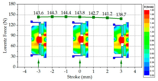 Figure 6 shows the Lorentz force with different strokes in magnetostatic FEM analysis. This analysis should be conducted because it is important to keep a constant force according to the strokes’ change. Without considering the eddy current, the Lorentz force and the inertia force of the movers are almost the same. The change in the Lorentz force and the inertial force of the movers within the change in the stroke was found to be about 5N. Flux density distribution shows that the flux density distribution of the lower solid core part is a little higher than that of the upper solid core part due to the added magnetic flux of the winding MMF and PM of the lower part.