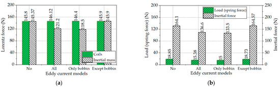 Figure 10a shows a comparison of the inertial and damping forces according to the eddy current loss of the material used when the current peak is 3A. In general, eddy current loss occurs when magnetic flux passes through a material with a high electrical conductivity. The Lorentz force generated by the coil reduces the force transmitted to the inertial mass because of the eddy current loss of the bobbin housing (aluminum) supporting the coil. The reduced force transmitted to the inertial mass is the damping force and is evaluated to have a peak of about 47 N.