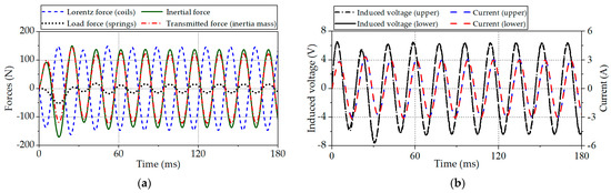 Figure 8 shows the transient dynamic analysis results of the main variables. Because current from voltage source is applied, there is an initial transient response until 60 ms. Figure 8a shows the results of various forces, such as the Lorentz force in the coils, the inertial mass force in the PM and solid core, the load force in springs, and the transmitted force as the inertial mass force, considering the loss of eddy current of key components through a coupled analysis at 3fn. Because the Lorentz force is the action force, the other forces are the reaction forces, and, thus, there is 180° anti-phase between the action force and the reaction forces. The load force is obtained by multiplying the generated vibration displacement by the spring coefficient, and, thus, it can be confirmed that the tendency of vibration displacement is the same. When the force transferred to the inertial mass is added to the spring force, it becomes the inertial mass force. Figure 8b shows the results of the induced voltage and current. These show that the induced voltage and current of both coil parts are balanced waveforms according to time. The value of the peak current is 3 A, which is within the limited range of the required design.