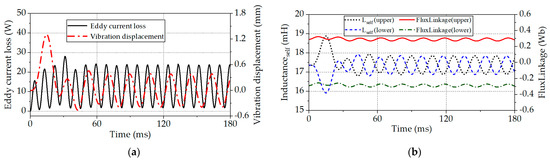 Transient dynamic analysis results of the proposed IMLA at 3fn. (a) Eddy current loss and vibration displacement; (b) inductance and flux linkage of the upper and lower coils.