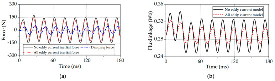 Transient dynamic analysis results of the proposed IMLA at 3fn. (a) Comparison of damping force and inertial force; (b) flux linkage of a half coil according to the eddy current of the material.