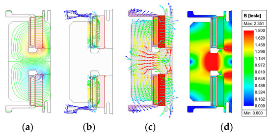 Figure 11 shows the flux line, Lorentz force on edge of the bobbin housings and coils, flux density vector, and flux density distribution at the proposed IMLA model at 3fn. Leakage flux lines, as shown in Figure 11a, are investigated. When the inertial mass part is moved, leakage flux is utilized as linkage flux through the coils, which generate upper and lower direction Lorentz forces.