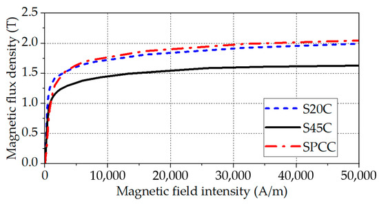 Improving thrust force is possible not only from an optimization standpoint but also from material selection. Figure 12 shows the B–H nonlinear curve according to the three materials (S20C, S45C, and SPCC) of carbon steel. In the linear region of the B–H nonlinear curve, when a material with a high permeability is effective and a material has a high saturation magnetic flux density, the thrust force of the linear actuator applied with S20C material is improved by more than 10%.