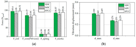 Forces comparison with different materials of the proposed IMLA at 3fn. (a) Forces in the coil, solid core with PM, spring, and inertia; (b) vibration displacement according to the solid core material.