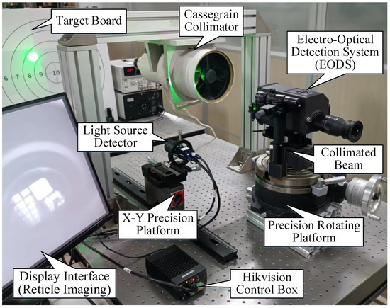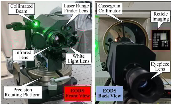The optical-mechatronics composition of an EODS is shown in Figure 1. As seen in the figure, the composition of the EODS includes a white light lens, an infrared lens, a laser range finder lens, an eyepiece and a collimated beam. The EODS is installed on a precision rotating platform. A Cassegrain collimator with the reticle is provided to simulate the infinity target and it also provides a reticle imaging observation point for the EODS.