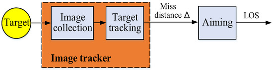 Figure 3 shows the traditional tracking controller model of an EODS. The tracker obtains the target resolution coordinate after collecting the image. Then, it calculates the miss-distance Δ between the target coordinate and the center coordinate of field view. The miss-distance is the angle deviation obtained by converting the number of pixels K, the lens resolution E × F, and the lens field angle . The unit of miss-distance Δ is mrad. The qualitative relationship of error correction can be thus obtained.
