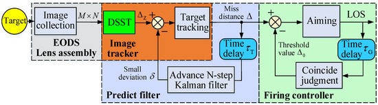 EODS is generally equipped with a tracking controller, which is used to calculate the miss-distance between the center of the target position and the center of the lens field-view in real time. It is also equipped with a judgment controller to select the firing time based on the miss-distance [6]. The core performance measure of an EODS is its targeting precision, especially for “low, slow and small (LSS)” fast-moving targets [7]. The specific performance indicators of the target are a distance of less than 500 m, area of less than 2 m2, and speed of 30~50 m/s [8]. In this case, the targeting precision of the EODS should be less than 0.15 mrad to accurately hit the target. To satisfy such a requirement, the dynamic performance of the line-of-sight (LOS) of an EODS, i.e., the stability response time, must be ensured. However, due to the intrinsic properties of the digital imaging systems of an EODS, time delay is one of the main obstacles to improving the EODS dynamics thus affecting the tracking and aiming performance of the electro-optical equipment.