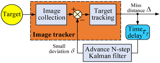 - Time-delay : It tracks the target according to the miss-distance Δ at a certain time in the past. When studying the small deviation of the image tracker at time , the time-delay should be subtracted. In Equation (1), the small deviation that is generated at time is corrected to reduce the adverse impact of time-delay on EODS firing.