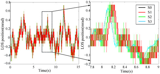 The model adopts the Runge Kutta fourth-order simulation, and the step length is set to 0.001 s. According to the linear motion transformation model, the LOS’s statistical data in the X azimuth direction are fitted as the frequency spectrum function. Then, the filter model inputs this function as the true value for testing. As shown in Figure 6, the black curve S0 represents the true value of the LOS. The red curve S1 represents the tracker measuring method. The green curve S2 represents the traditional moving-average filter method. The blue curve S3 represents the optimized design advanced N-step Kalman filter prediction method.