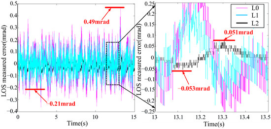 In Figure 7, the red curve L0 represents the inherent measured error between the image tracker’s measured value and the LOS’s true value. The blue curve L1 represents the traditional method’s measured error between the moving-average filtering value and the LOS’s true value. And the black curve L2 represents the optimal method’s measured error between the advanced N-step Kalman predicted value and the LOS’s true value.