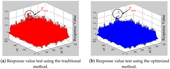 As shown in Figure 11a, an aerial view of the complex background is used as the single-sample training data of anti-occlusion DSST target tracking. Figure 12a,b shows the response value distribution comparison of two different methods. In Figure 12, the X-Y axes represent the resolution coordinates of the examination image. Z axis represents the response value distribution. There are multiple points in the black circle, but the highest point on the Z-axis is the response maximum . Except for the maximum scatter, the more the interference scatters in the black circle, the more the occurrence of false detection. Compared with the traditional template matching method, the number of interference scatters of the optimized DSST tracking method is significantly decreased. The traditional method’s response maximum is 0.4, the optimized method’s response maximum is 0.7. Both of them can detect the cross target position. However, the response ratio of the optimized method increases by 42.9%. It shows that the target tracking stability of the optimized method is significantly improved and it can thus effectively avoid the target detection failure.