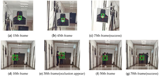 Figure 11b displays a target manipulator. As shown in Figure 2 and Figure 11b, the length of the connecting rod is 70 cm. The target board rotates clockwise at an angular speed of 10°/s. Figure 13 and Figure 14 show the target tracking test results of the four groups of image sequences. The tracking distance of the rotated target is 50 m. The moving speed of the occlusion object is about 1.2 m/s. The tracking distance of the occluded target is 100 m.