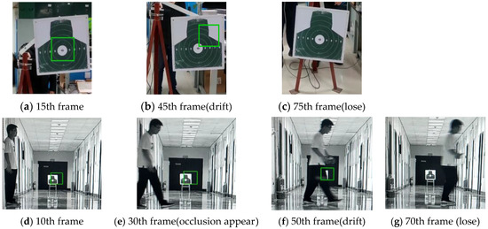 In Figure 13a–c and Figure 14a–c, the traditional method causes a tracking drift error at the 45th frame and completely loses the target at the 75th frame. Compared with the traditional method, the optimized method can accurately and stably track the target’s motion. In Figure 13d–g and Figure 14d–g, compared with the traditional method, the optimized method can resist target occlusion. At the 30th frame, the occlusion object appears from the left. The traditional method causes a tracking drift error at the 50th frame and completely loses the target at the 70th frame. It shows that the anti-occlusion DSST tracking method can stably output the miss-distance Δ and improve the tracking precision.