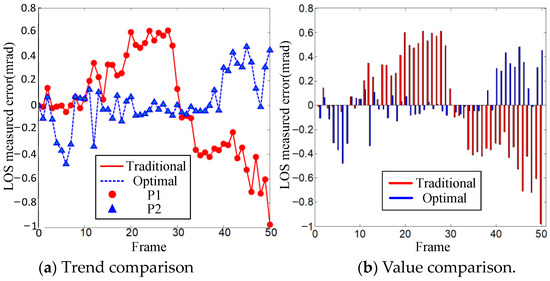 As shown in Figure 16, the trend of the LOS and the value of the two methods are compared through different manifestations of the same data. Figure 16a shows the line statistical chart. The red solid line represnts the measured error of the LOS via the traditional method, and the blue dotted line represents the error measured via the optimal method. Figure 16b shows the bar stacking chart. The red and blue areas represents the traditional method and the optimal method, respectively. The red curve is the control group. In Figure 16a, the blue curve has the same changing trend as the standard red curve. It shows that the optimized method can basically reflect the dynamic change in LOS’s position. However, compared with the red curve, the blue curve is closest to the Y = 0 mrad. It shows that the optimized method has a higher test accuracy.