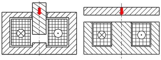 The MSM sticks’ depth of 5 mm was used to define the theoretical depth for both actuator variants in the 2D FEA simulation since this was the minimal possible dimension for each design. Exterior to the stick, the magnetic circuit was designed to create and guide the magnetic flux considering the correct orientation of the generated magnetic field (vertical magnetic field orientation for horizontally aligned sticks and horizontal magnetic field orientation for vertically aligned sticks) to enable the sticks’ elongation according to Section 2.2.